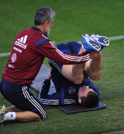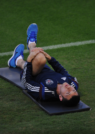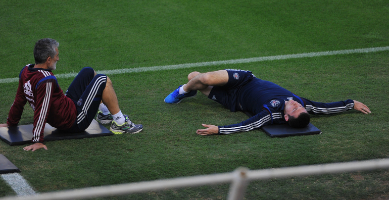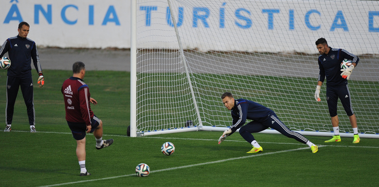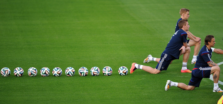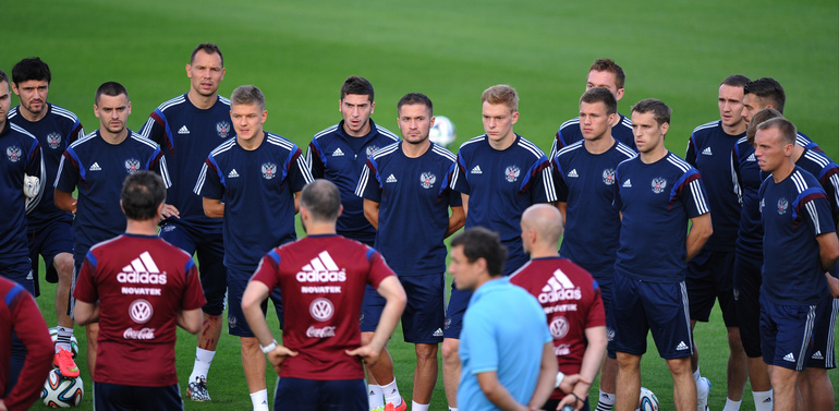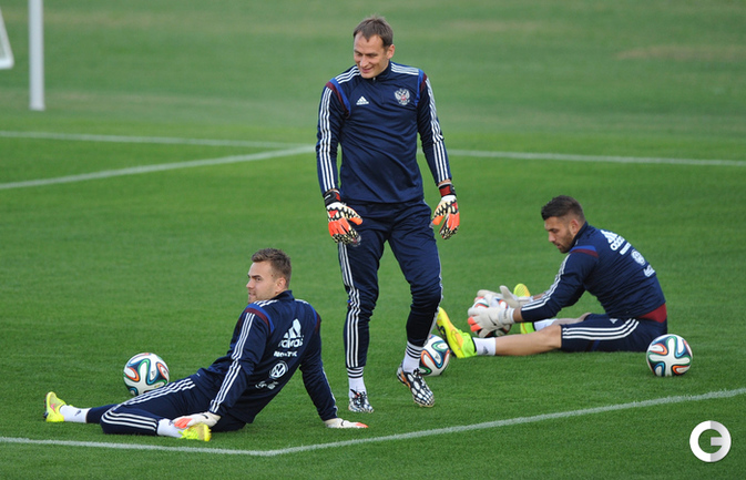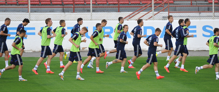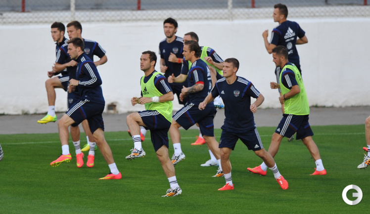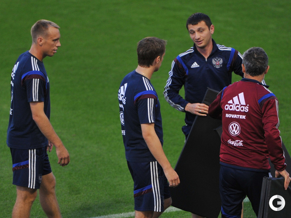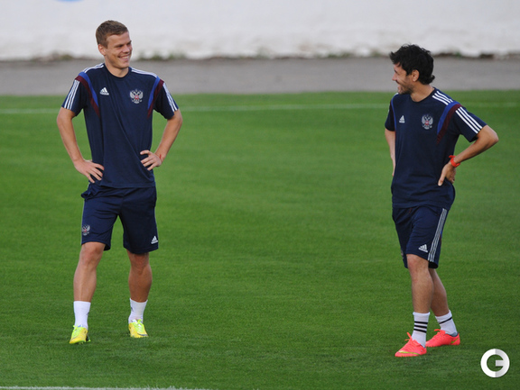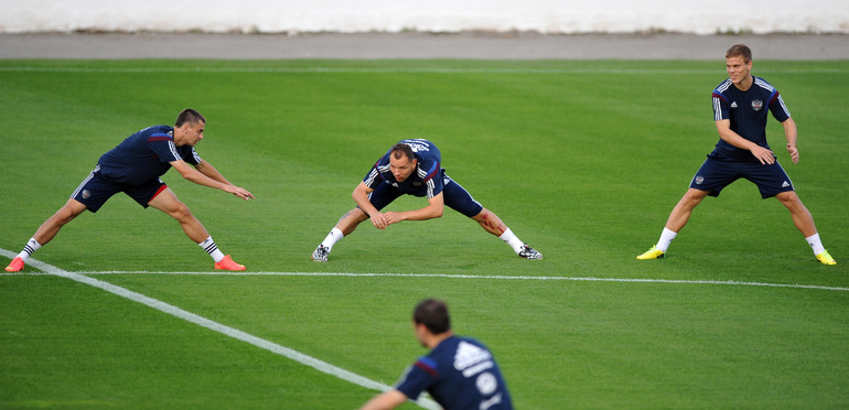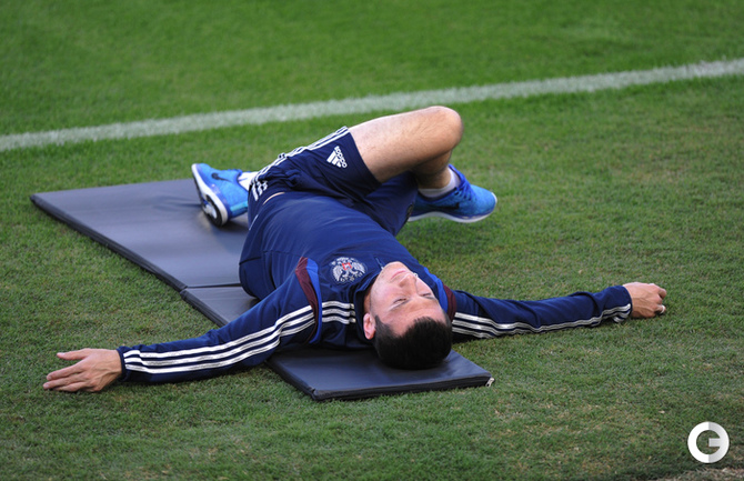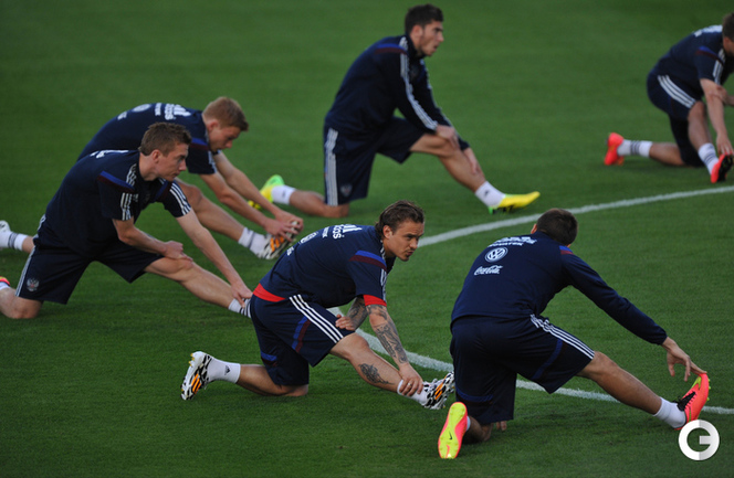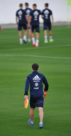 8 июня. Иту. Сборная России после 15-часового перелета из Москвы в Бразилию вышла на первую тренировку в городе своего базирования во время ЧМ-2014. Индивидуально работали Алан Дзагоев, который прибыл на занятие на 15 минут позже, а также присоединившиеся к нему после разминки Денис Глушаков и Дмитрий Комбаров. Фото - Александр ФЕДОРОВ, "СЭ"