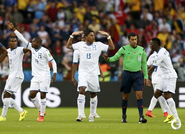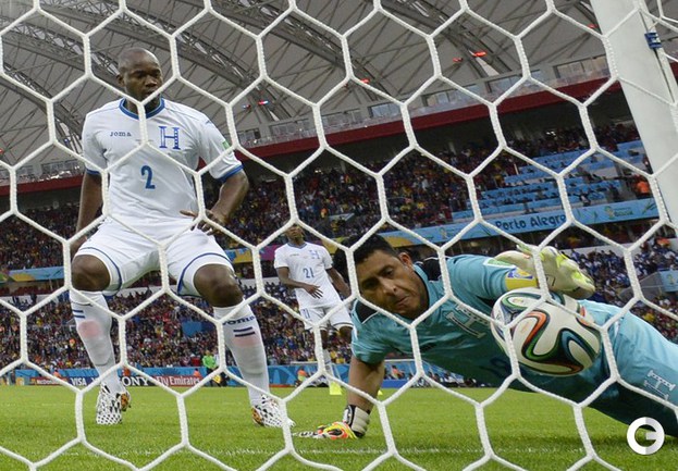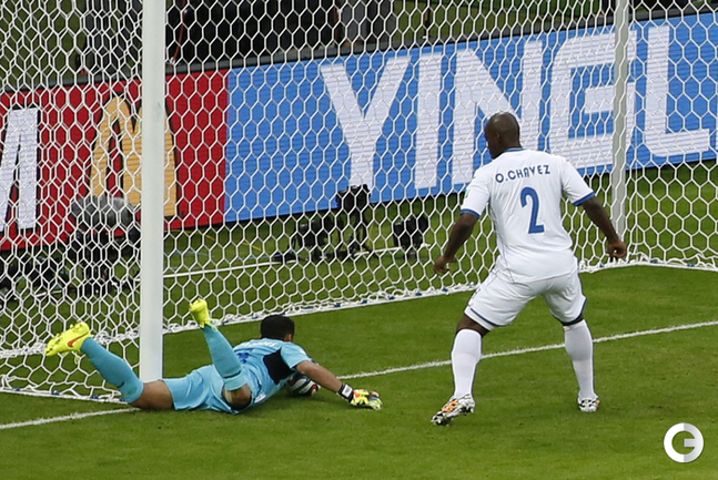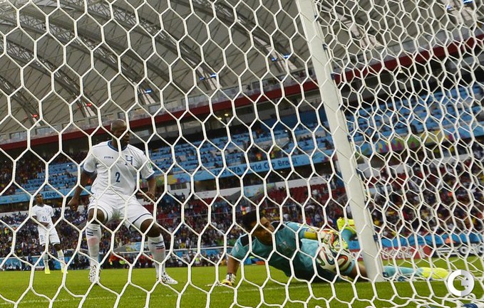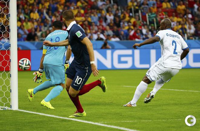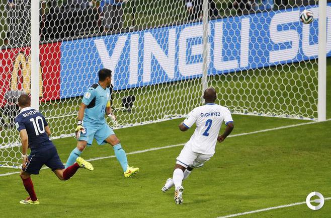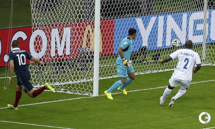 15.06.2014. В матче Франция - Гондурас впервые в истории чемпионатов мира гол был засчитан с помощью электронной системы определения взятия ворот. На 48-й минуте после удара нападающего "трехцветных" Карима Бензема мяч попал в штангу, но не пересек линию ворот, что показала система, а затем снаряд рикошетом от вратаря Ноэля Вальядареса едва заметно пересек линию ворот - голкипер оперативно вернул его в поле. Вальядареса попытался опротестовать решение, но судья из Бразилии Сандру Рикки обратился к "помощи компьютера" и засчитал гол - счет стал 2:0. Фото AFP, REUTERS