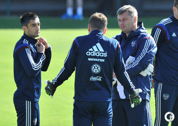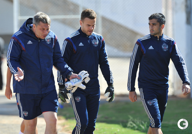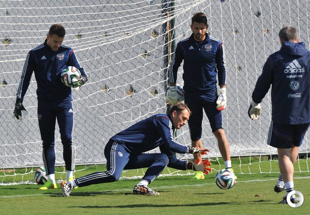 Акинфеев ловит мячи на тренировке сборной России в Иту