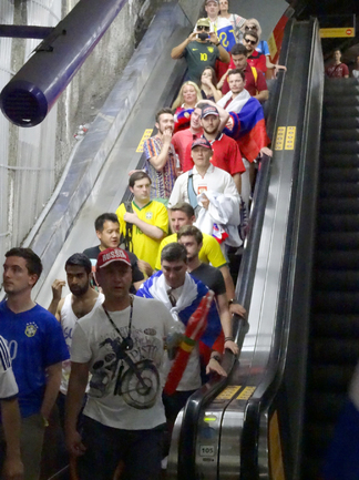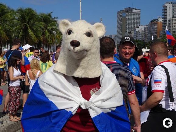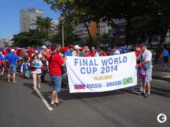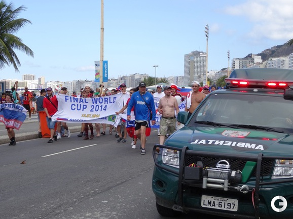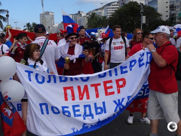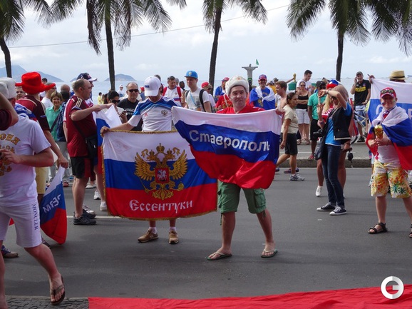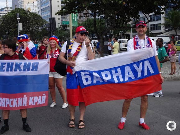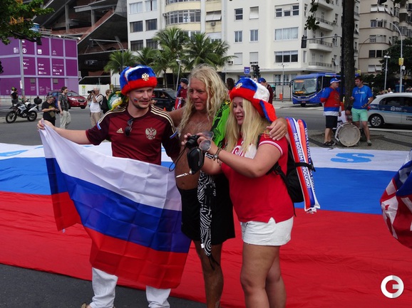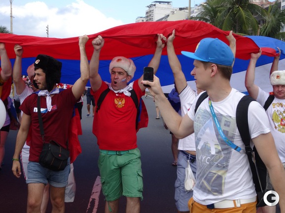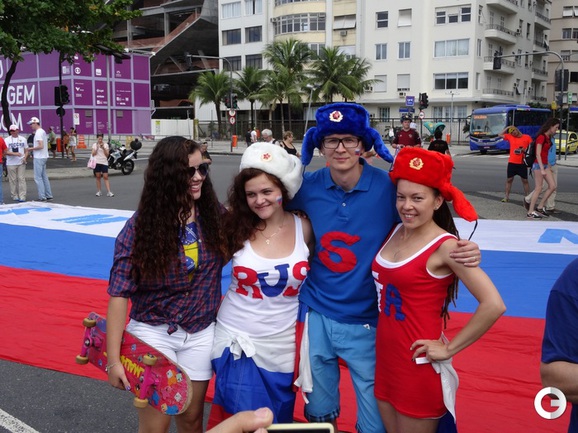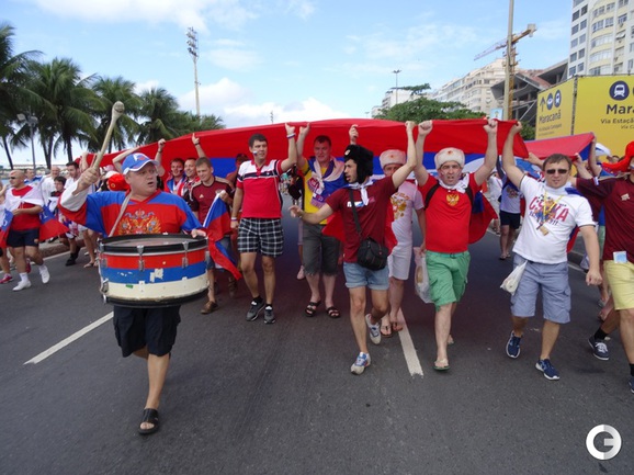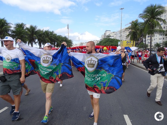 "Русский марш" российских болельщиков по пляжу Копакабаны и улицам Рио-де-Жанейро перед матчем сборных России и Бельгии. Фото - Александр Бобров, "СЭ". Фото - Александр Бобров, "СЭ"