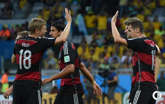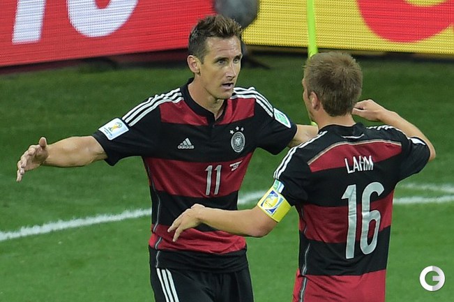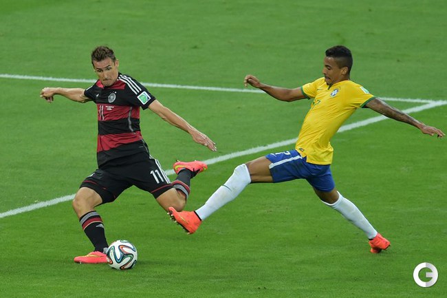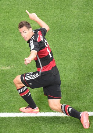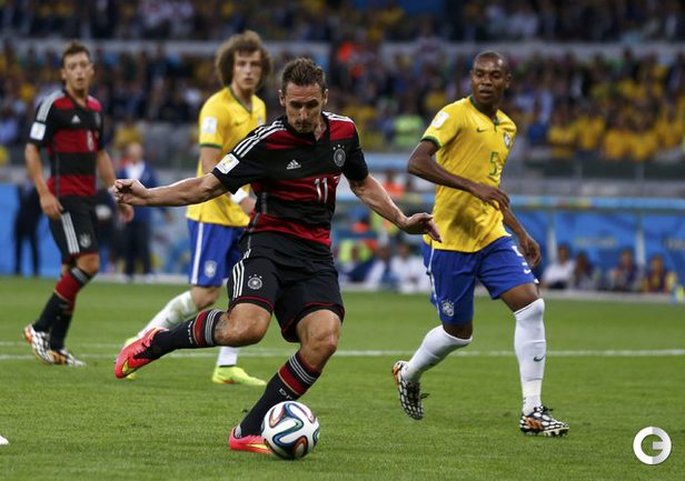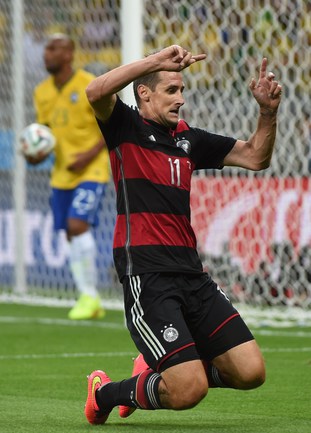 Белу-Оризонти. Бразилия - Германия. 23-я минута. Отправив мяч в ворота бразильской сборной, нападающий немцев Мирослав Клозе стал лучшим бомбардиром в истории чемпионатов мира, опередив Роналдо. На его счету теперь 16 мячей в финальных стадиях турнира. Фото AFP, REUTERS