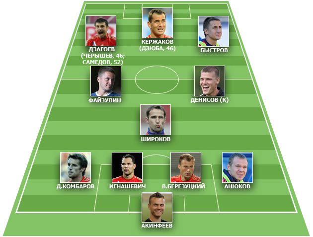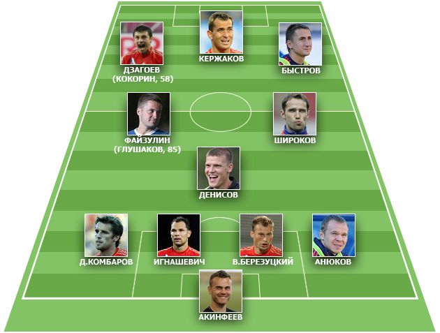 Акинфеев - Анюков, В. Березуцкий, Игнашевич, Д. Комбаров - Широков, Денисов, Файзулин (Глушаков, 85) - Быстров, Кержаков, Дзагоев (Кокорин, 58).