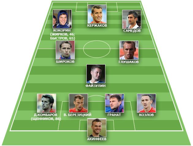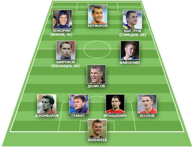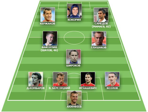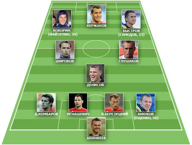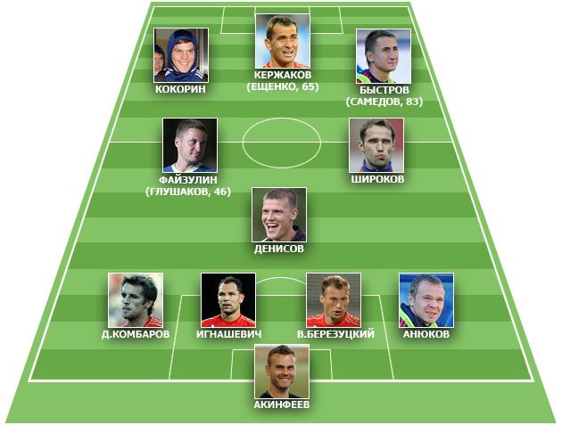 Акинфеев - Козлов, Игнашевич, Гранат, Д. Комбаров - Файзулин, Денисов, Широков (Рязанцев, 82) - Быстров (Самедов, 68), Кержаков, Кокорин (Ионов, 46).