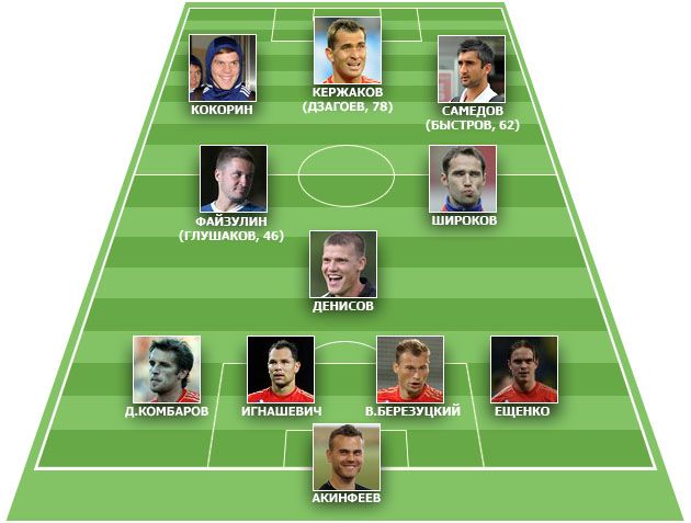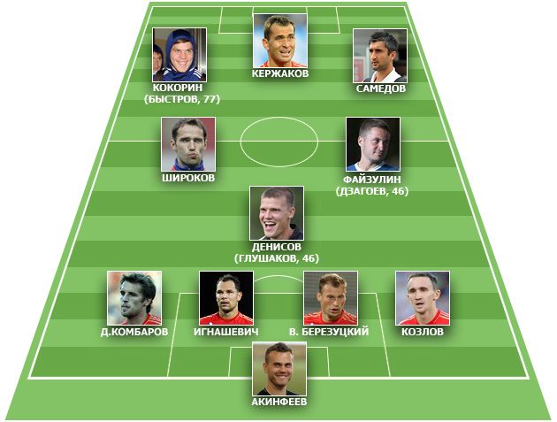 Акинфеев - Ещенко, В. Березуцкий, Игнашевич, Д. Комбаров - Широков, Денисов, Файзулин (Глушаков, 46) - Самедов (Быстров, 62), Кержаков (Дзагоев, 78), Кокорин.