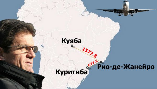 Матчи группового этапа сборная России проведет в трех городах: сначала отечественные футболисты отправятся на границу с Боливией – в штат Мату-Гросу. Из его столицы – Куябы – игрокам и тренерскому штабу предстоит двухчасовой перелет в Рио-де-Жанейро (1577 км), откуда еще 677 км до Куритибы. Итого: 2254,9 км. Это сравнимо, например, с расстоянием из Москвы до Омска или Парижа в один конец.