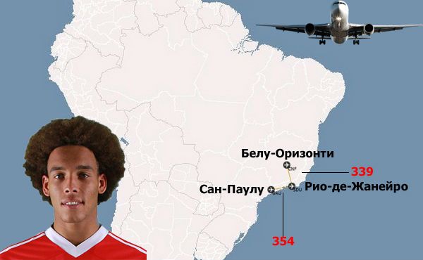 Больше всех повезло главному сопернику россиян по группе – бельгийцам. Они возглавляют список сборных, которым предстоит на групповом этапе преодолеть минимальное расстояние: 339 км от Белу-Оризонти до Рио-де-Жанейро и 354 км от Рио до Сан-Паулу. Все города компактно расположены на юге страны – дорогу вполне можно осилить и на автобусе.