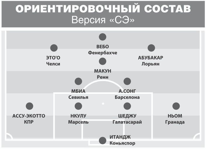 Ловких техничных футболистов в сборной, как всегда, хватает. Нападающий Абубакар, действуя за "Лорьян", входит в чемпионате Франции в число лучших бомбардиров. А ему только исполнилось 22 года. О центральных защитниках Шеджу ("Галатасарай", 28 лет) и Нкулу ("Марсель", 23 года) известно давно, о родившемся во Франции 29-летнем Ассу-Экотто (КПР) – тоже. Прекрасно знакомы широкой публике А.Сонг ("Барселона"), Эно ("Аякс"), Мбиа ("Севилья"). И все-таки выход "Львов" из группы впервые после периода Непомнящего выглядит проблематичным.