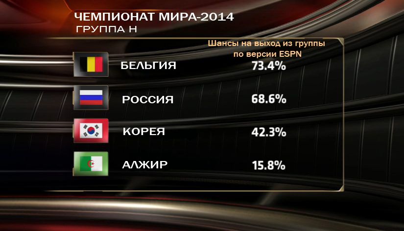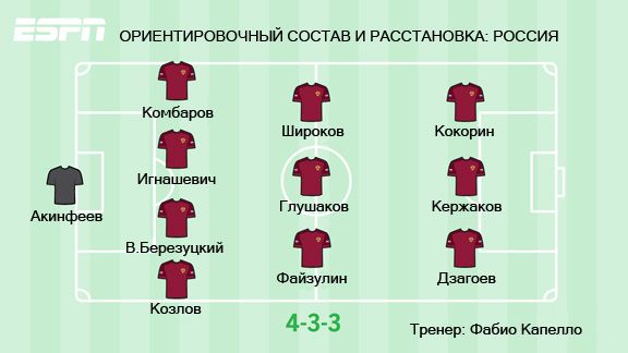 Ориентировочный состав и расстановка России по версии ESPN (4-3-3): Акинфеев – Козлов, В. Березуцкий, Игнашевич, Д. Комбаров – Файзулин, Глушаков, Широков – Дзагоев, Кержаков, Кокорин. Без Денисова и с Дзагоевым.