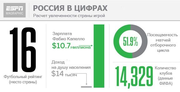 Расчет национальной увлеченности футболом основан на том, как хорошо страна платит своему первому тренеру, посещает матчи и играет сама. Цифры России – 16-е место в рейтинге ESPN, зарплата Фабио Капелло в 10,7 миллиона долларов (при доходе на душу населения в 14 тысяч долларов), 51,9 процента заполненных мест на матчах отборочного цикла и 14 329 клубов (по заявке ФИФА).