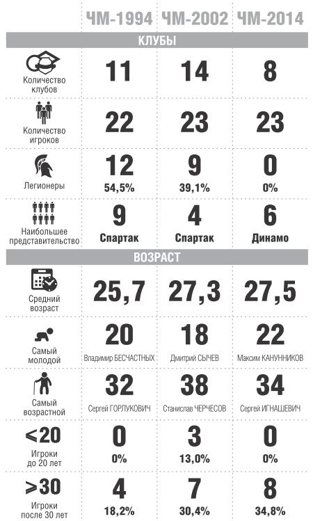 Впервые в составе сборной России на мировой чемпионат поедут 8 игроков, которые уже достигли 30 лет, а средний возраст – 27,5 года. Самым юным российским футболистом на ЧМ-2014 будет Максим Канунников, которому сразу после окончания первенства исполнится 23. Снова самыми возрастными оказались вратари и защитники. Так, в 1994-м в обороне было 3 игрока "за 30" – вратарь Станислав Черчесов (30 лет), защитники Сергей Горлукович (32) и Дмитрий Галямин (31). Всего же в той команде Павла Садырина было лишь 4 возрастных игрока. К вышеперечисленным добавился нападающий Александр Бородюк (31). А самым молодым оказался Владимир Бесчастных, поехавший в США в 20-летнем возрасте.
