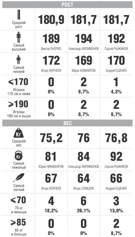 Самый высокий – значит, и самый тяжелый. Так было у Романцева в 2002-м, так есть и в сборной Капелло-2014. Игровой вес высокорослого Рыжикова – 92 кг, миниатюрного Ещенко – 66. Интересно, что нынешняя сборная России – самая тяжеловесная из трех. Помимо Рыжикова больше 85 кг весит защитник Андрей Семенов (рост 190 см, вес 86 кг). Примечательно, что сборная-2002 не самая легковесная, но в ней играли сразу 6 футболистов, чей вес не превышал 70 кг – Игорь Семшов (64), Алексей Смертин (65), Дмитрий Аленичев, Кержаков (по 67), Измайлов и Сычев (по 70).