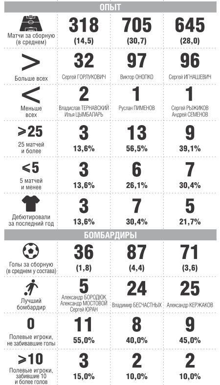 Интересно, что все три тренерских штаба, которые возглавляли сборную на мировых чемпионатах, обязательно включали в свои списки игроков, которые фактически не имели опыта выступлений за главную команду страны. Так, Романцев в 2002 году взял Измайлова (8 матчей на тот момент), Вячеслава Даева (7), Дмитрия Сенникова (4), Кержакова, Сычева (по 3), Семшова (2) и Пименова (1). У итальянского специалиста вчерашних дебютантов поменьше – пятеро. Это Алексей Козлов (10 игр), Владимир Гранат (4) Максим Канунников, Юрий Лодыгин (по 2) и Андрей Семенов (1).