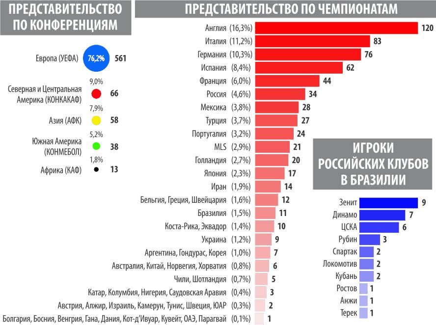 Италия с Германией заметно отстают, Испания с Францией – и подавно. А дальше уже Россия. На родине выступают все 23 бойца Капелло, а еще 10 человек наша премьер-лига делегирует в сборные всего света: Бельгии, Ганы, Коста-Рики, Нигерии, Португалии, Хорватии, Эквадора и, конечно, Бразилии в лице Халка.
