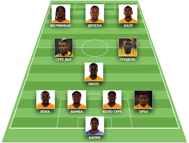 Кот-Д'Ивуар: Барри, Туре, Бока, Бамба, Орье, Тьоте, Серей Ди, Дрогба, Калу, Жервиньо, Градель.