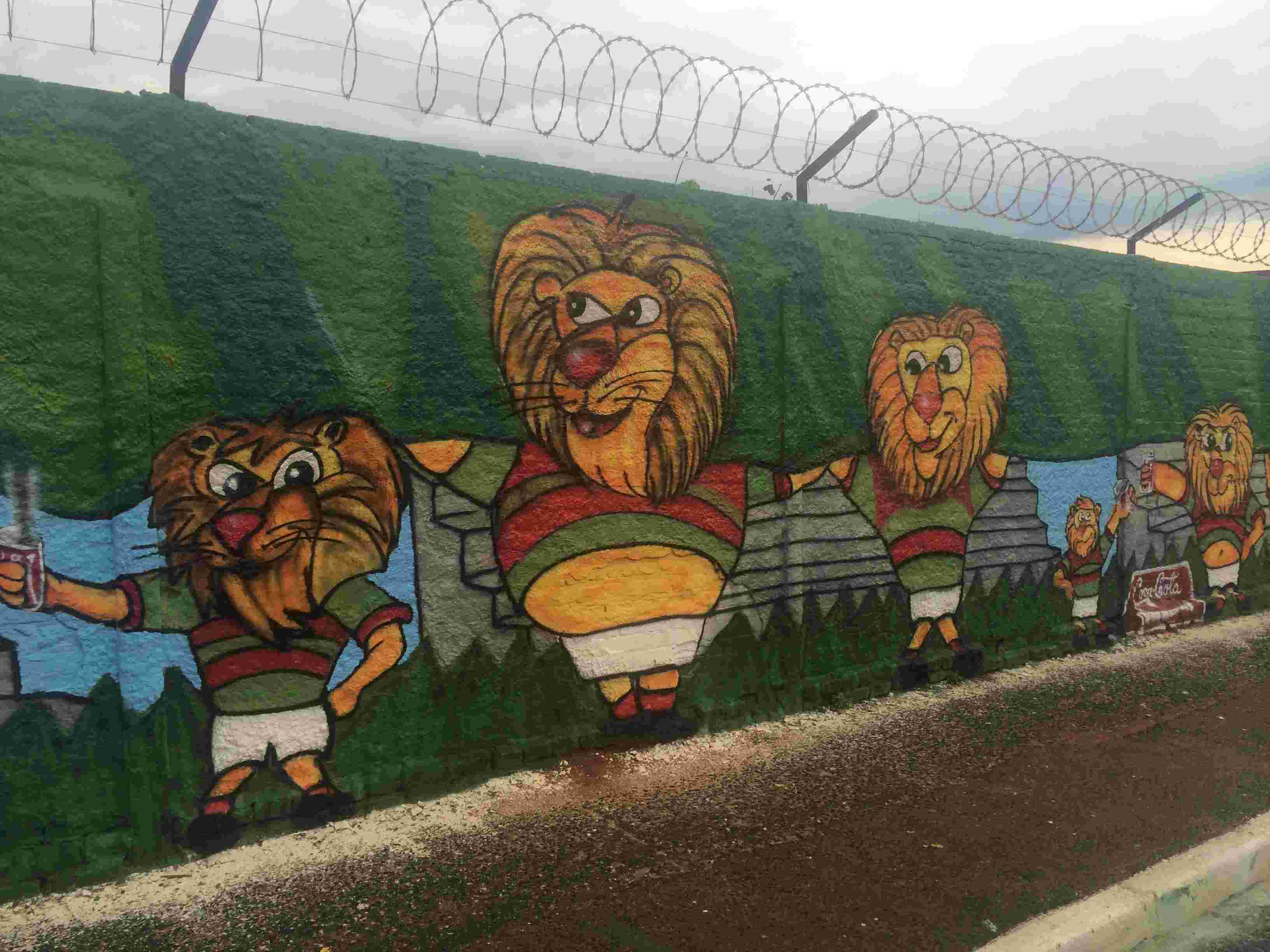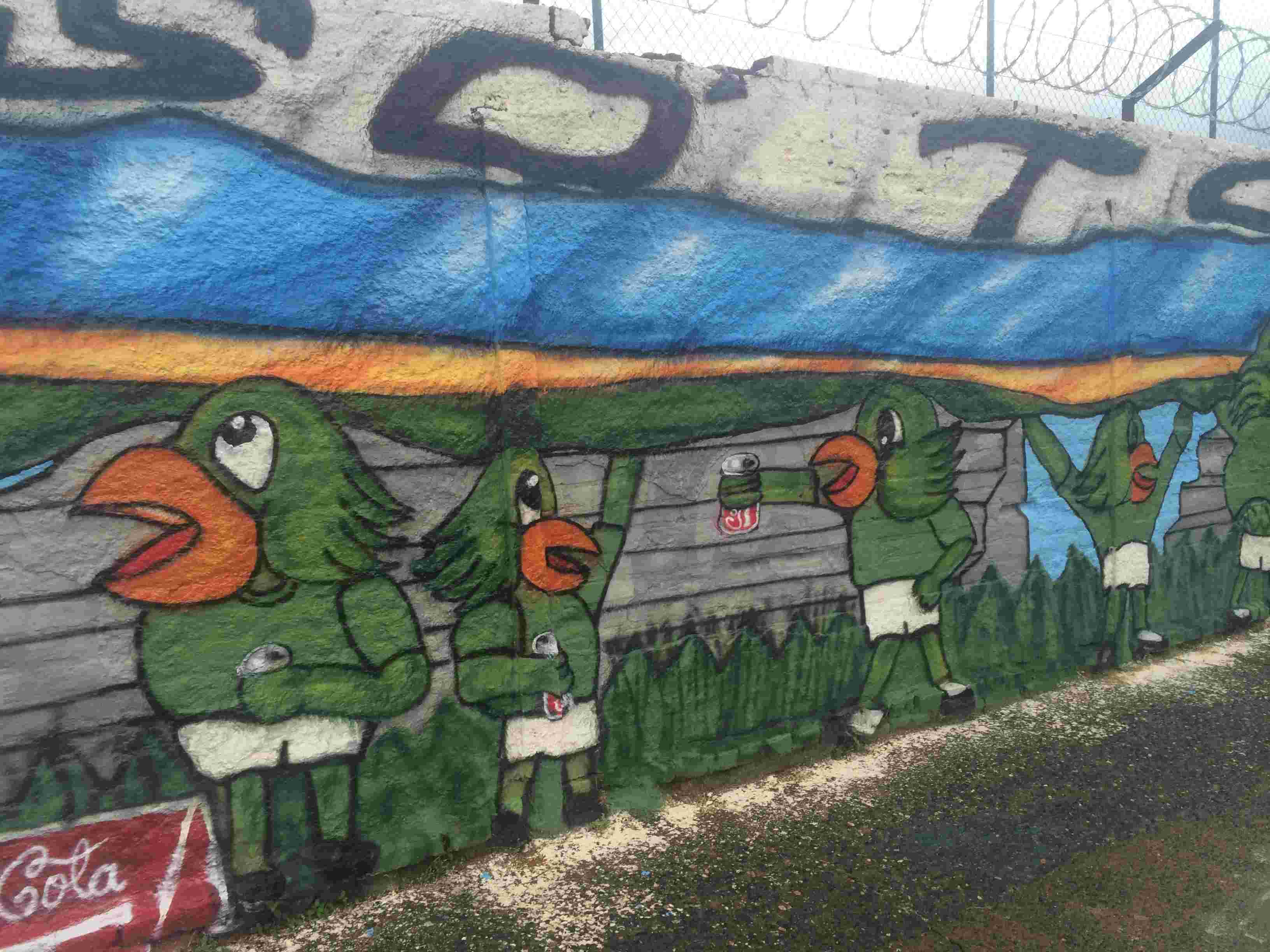 Территория стадиона обнесена забором с колючей проволокой, что соответствует принципам, которыми руководствуется Фабио Капелло при подготовке сборной России к ЧМ-2014. К счастью, бюро граффити Иту облагородило своими работами одну из стен, и это придает арене атмосферу праздника.