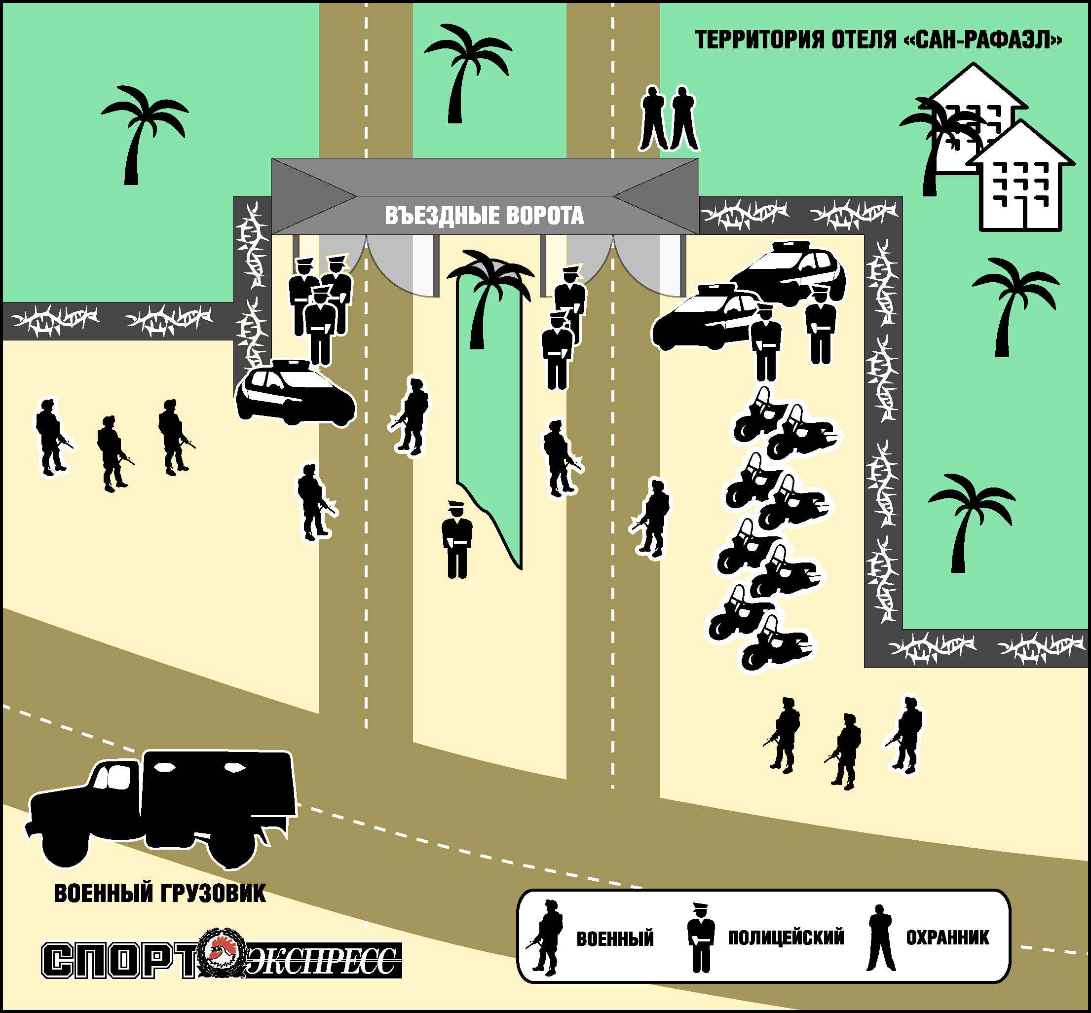 Если до прилета команды Капелло у металлических ворот отеля сидела на стульчиках лишь парочка охранников в черных костюмах, то теперь там 24 часа в сутки дежурит целая армия. Охрану можно разделить на три группы: военные в камуфляже и беретах, вооруженные автоматами; полиция на автомобилях и мотоциклах с пистолетами; сотрудники местного ЧОП, те самые люди в черном.