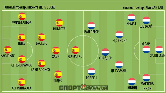 Против сильных соперников дель Боске предпочитает играть с двумя опорными хавбеками, которыми должны стать Бускетс и Хаби Алонсо. На третью вакансию в полузащите больше всего шансов у Хави, а фланги атаки должны занять Иньеста и Педро, лучший бомбардир сборной последних двух лет. Впрочем, дель Боске может и удивить, подготовив какой-либо сюрприз с учетом весьма своеобразной тактики голландцев.