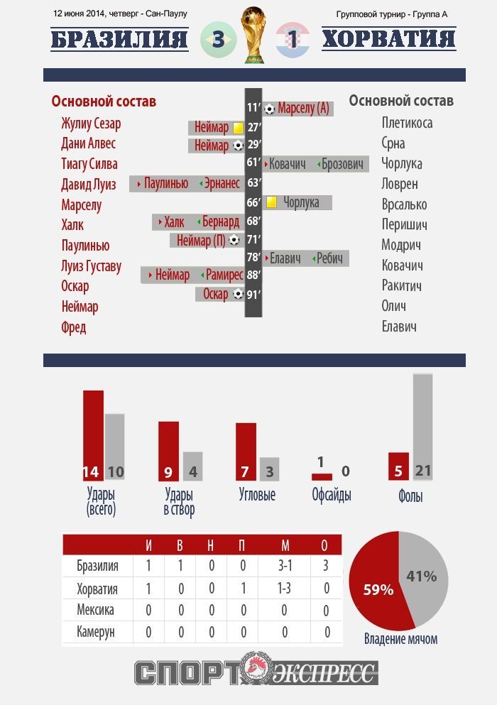 "СЭ" и InStat Football представляют детальный статистический разбор матча открытия ЧМ-2014 Бразилия – Хорватия, где крайне неудачно выступил Халк, зато блистали Неймар с Оскаром и старина Олич.