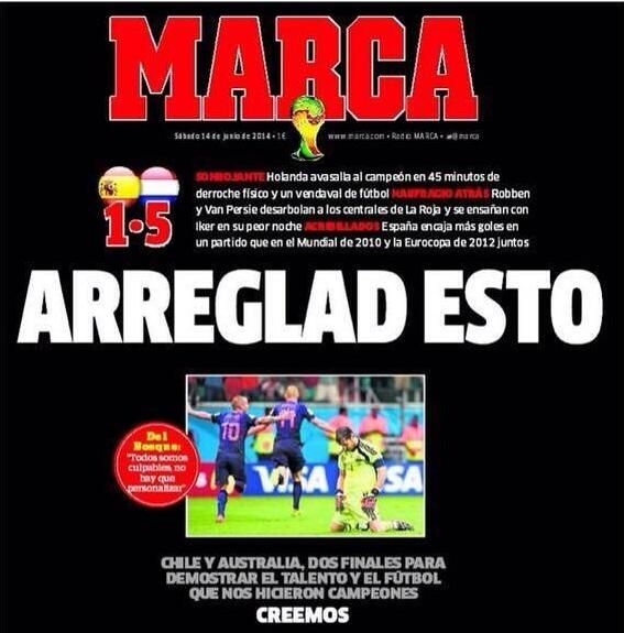 Ответом испанскому противнику была восхитительная "рыбка" ван Перси перед перерывом и дивное завершение Роббена после. Оба раза вожакам команды ассистировал левый крайний Блинд, а Пике, Серхио Рамос и Касильяс оставались статистами. Третьим ворота чемпиона поразил де Фрай: запоровший при нулевом счете выход один на один Снайдер подал, капитан Касильяс к своему возмущению столкнулся с капитаном ван Перси, а защитник замкнул дальнюю штангу и выпустил из соперника воздух. Вдогонку над вратарем после его с партнерами ошибок поиздевались все те же форварды. Ван Перси первым догнал в списке снайперов Неймара. Принявший у партнера повязку Роббен будто изгонял демонов финала-2010, в своем рывке через полполя оставив за спиной Рамоса и растоптав в штрафной Касильяса.