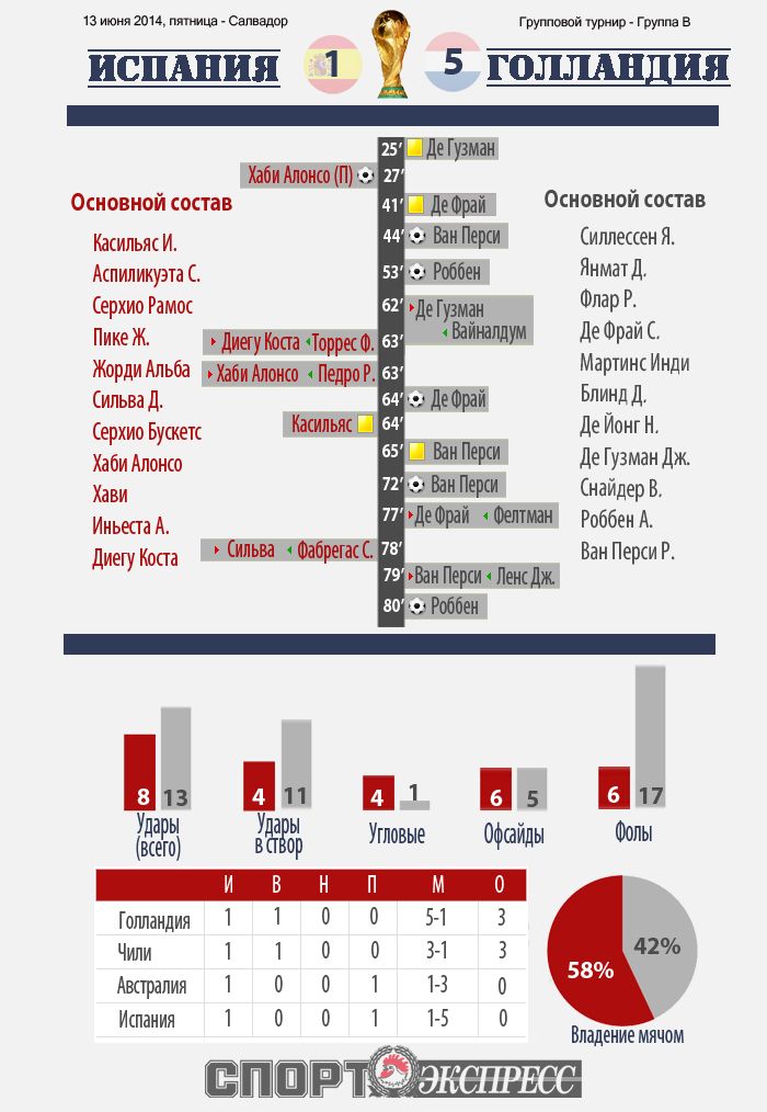 "СЭ" и InStat Football представляют статистический разбор матча Испания – Голландия, в котором крайне неудачно сыграли испанцы во главе с Диегу Костой, но зато блистали Арьен Роббен и Робин ван Перси.