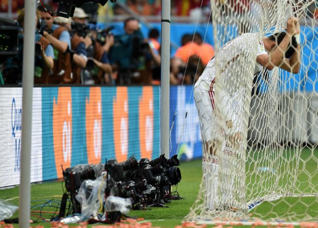 Вдобавок сборной Испании не повезло: после двойной замены дель Боске команда просто не успела перестроиться и через считанные секунды пропустила третий гол. А при счете 1:3 испанцы вдруг сдались. У команды не было ни воли, ни характера – ничего. Стоило де Фрею забить третий мяч, как сборная Испании превратилась в боксера, опустившего руки и получающего удар за ударом. Футбол кончился, дальше было издевательство. Сообщение из официального твиттера сборной Испании, написанное на 86-й минуте, выглядело уже как злая ирония: "Какой прекрасный двойной сэйв Касильяса! Испания – Голландия – 1:5. Вперед, Испания!"