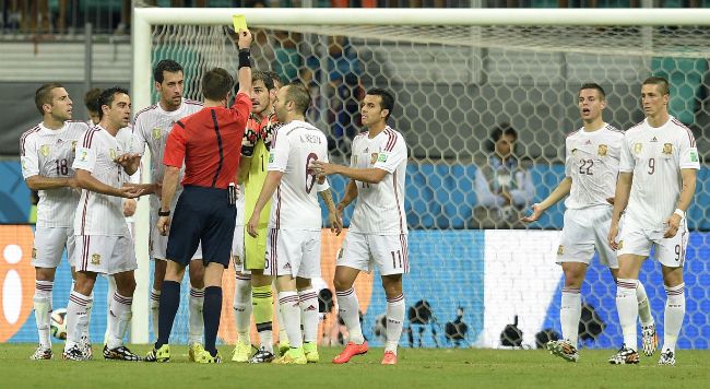 Почти половина матча прошла по привычному для сборной Испании сценарию, ведущему как раз к итоговой нудноватой победе 1:0. Ла Роха вполне уверенно контролировала игру, ведя планомерную атаку подступов к чужой штрафной, и даже кое-как забила – нещадно освистываемый бразильской торсидой "Иуда" Диегу Коста изобразил падение, и весьма сомнительный пенальти реализовал Хаби Алонсо. Испанцы провели первый тайм вполне добротно, качество их игры было даже чуть выше ожидавшегося. Вертикальных пасов стало больше, а прессинг хорошо работал, особенно у Давида Сильвы, неожиданно появившегося в основе вместо Педро.