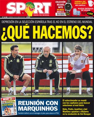 Каталонская газета "Sport" на обложку воскресного номера поместила фотографии задумчивых Касильяса, Хави и Дель Боске и подписала коллаж крупными буквами "Ну, что делать будем?", как бы намекая, что только совместными усилиями можно найти выход из кризиса. Весь первый разворот посвящен собранию тренерского штаба и капитанов, на котором были приняты важные тактические решения перед игрой с Чили. Какие – не поясняется, но Sport полагает, что состав испанцев будет значительно обновлен.