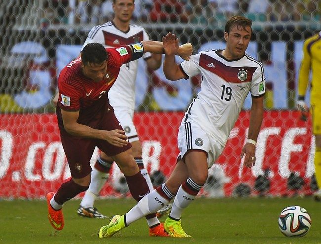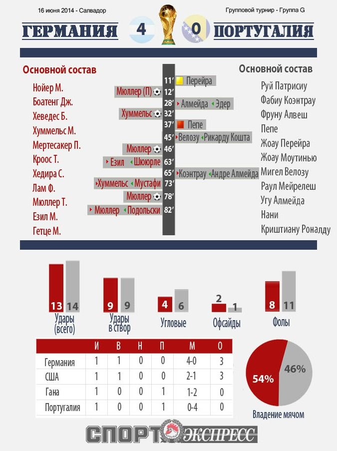 Такого преимущества одной из команд в выигранных единоборствах не знала даже Голландия в игре против Испании. Немцы победили в 75 дуэлях из 132 (56,8%), причем игроки атакующего плана, обычно имеющие показатели в районе 20-30 процентов, на этот раз выходили победителями как минимум каждый второй раз. Томас Мюллер, нанес 4 удара, превратившиеся в 3 гола. Из которых два как раз были забиты после контактной борьбы с Бруну Алвешем и Жоау Перейрой. Автор первого хет-трика ЧМ-2014 выиграл 11 из 16 единоборств (запредельные для игрока атаки 68,8%!). А среди важных проиграл, пожалуй, лишь одно – бодание с Пепе, что все равно сыграло немцам на руку – португалец был удален с поля. Соответствующие показатели Гетце – 13 из 26, Езила – 4 из 8. Таким образом, "подбор на чужом щите" был полностью за бундестим во главе с Мюллером, что и обусловило победу с таким большим преимуществом.