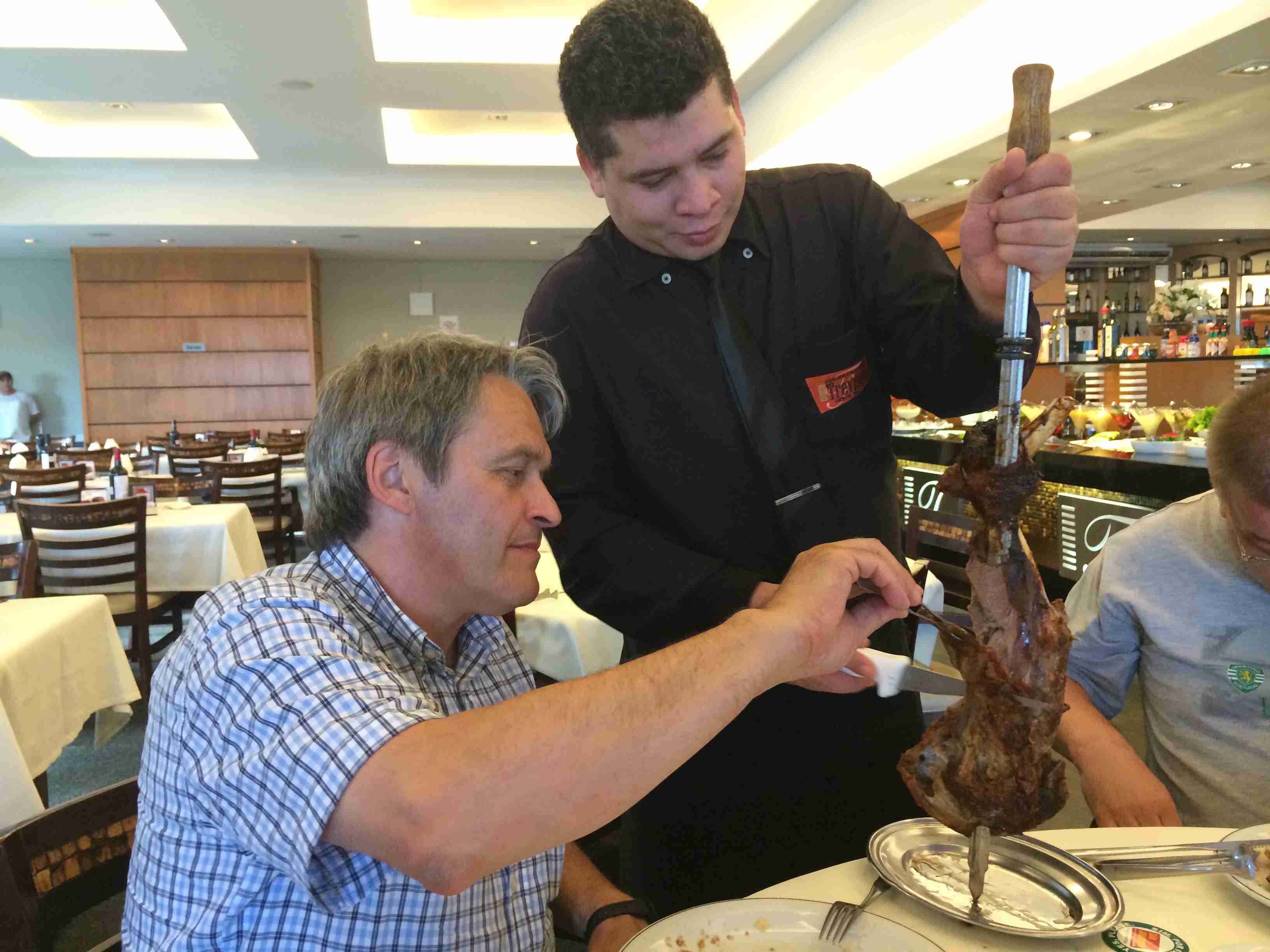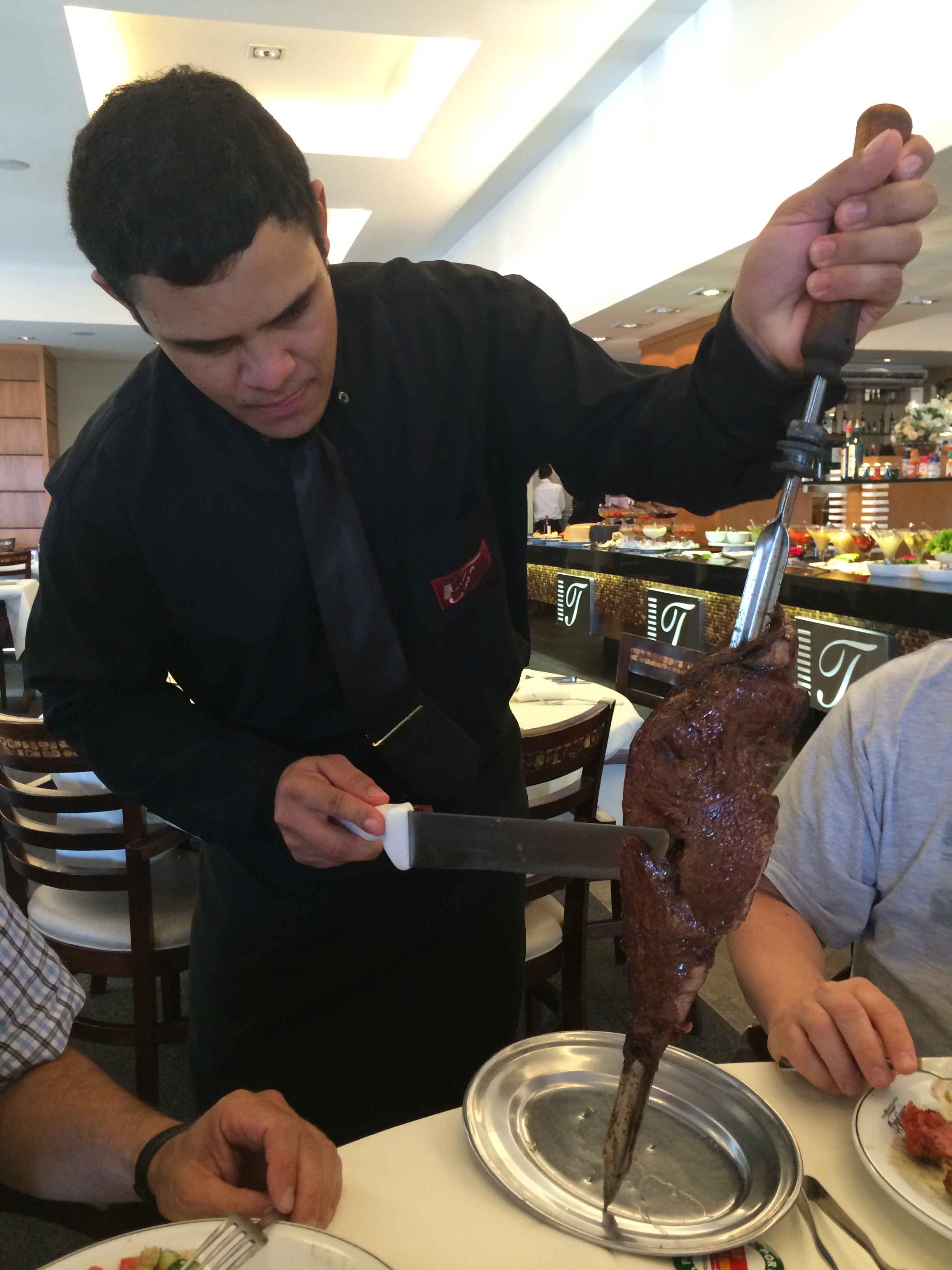 Зато какую еду! Официанты один за другим подлетают с огромными шампурами, на которых приготовлены циклопические куски разнообразного мяса, преимущественно говядины. Помимо стандартных вилки и ложки на столе лежат щипчики, которыми ты подхватываешь тоненькие кусочки, отрезаемые кухонные ножом типа мачете. В одном из лучших "шурраскарий" Кампинаса нам в итоге предложили на выбор около 30 видов – хотел сказать мяса, но были же там и курица, и рыба, и жареные бананы, и местные чебуреки, которые привели в натуральный восторг нашего шефа бригады Бориса Левина. Во рту тают свиные ребрышки, кобаски и, конечно, фантастическая говядина – с кровью или прожаренная до готовности, мягкая, сочная, иногда с жирком. Каждому свое. Кроме того, есть салат-бар – со здоровенными головками сыра, десятками соусов, фирменными блюдами местной кухни, например, фейжоадой и новой бразильской модной пищей – роллами. Количество подходов не ограничено. По идее, можно попросит официанта снять с шампура кусок весом в несколько килограмм и положить тебе на тарелку, но так не принято. В некоторых шашлычных предлагают и мясо, жареное на гриле.