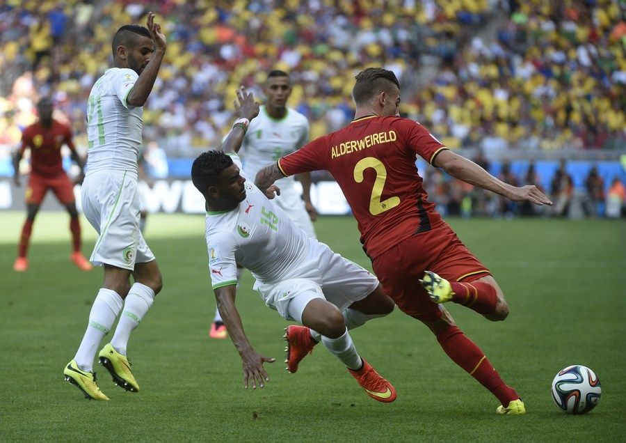 В первом тайме матча Бельгия – Алжир нелегко было предположить, что все закончится победой европейцев – фаворитов поединка. Медленные перепасовки мяча на подходах к штрафной площади алжирцев заканчивались потерями либо неопасными дальними ударами, а вся игра шла, в основном, через защитников. Об этом наглядно говорит и статистика. Самыми пасующими в матче оказались 4 игрока обороны бельгийцев, а также полузащитник "Зенита" Аксель Витсель. Больше же всех передач в составе сборной Бельгии отдал 196-сантиметровый защитник Даниэл ван Бюйтен – 89, из которых 81 оказалась точной (91,0 процента). Капитан команды и напарник ван Бюйтена по центру обороны Венсан Компани, а также крайний защитник Ян Фертонген сделали по 72 передачи, но процент точных у Компани оказался выше – 95,8 (69 точных), против 84,7 (61). В активе же другого крайнего оборонца Тоби Алдервейрелда 59 точных пасов из 70 (84,3 %). При этом игрок мадридского "Атлетико" успевал часто подключаться к атакам своей команды и записал на свой счет 6 передач в штрафную площадь соперника, что является вторым результатом в команде (и в матче в целом) после Дриса Мертенса (9). Примечательно, что все игроки сборной Бельгии отдали 634 передачи, а защитники на четверых – 303 (47,8 %).