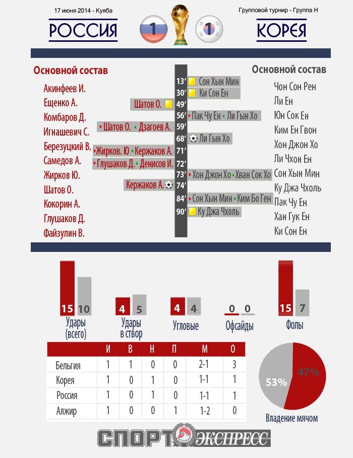 Отрадно, что наша команда не боялась наносить дальние удары, хотя иногда это происходило скорее от безысходности. Всего игроки сборной России нанесла 15 ударов по воротам Чон Сон Рена, корейцы – только 10. Правда, корейцы били точнее – 5 попаданий в цель против наших 4. Российские точные выстрелы – это Игнашевич, плотно пробивший со штрафного на 32-й минуте, Комбаров, мощно зарядивший с дальней дистанции на 63-й, и пара Дзагоев-Кержаков, соорудившая ответный гол. Мимо россияне нанесли еще 7 ударов, а 4 попытки заблокировали соперники. Так что едва ли не главная задача россиян – поправить прицел к ближайшему матчу против Бельгии. В створ ворот которой игроки Алжира (если не считать пенальти) так и не нанесли ни одного удара.