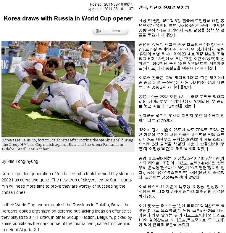 The Korea Times: "Да уж, ушло великое поколение футболистов, воспитанных Гусом Хиддинком и штурмовавших вершины ЧМ-2002. Новому созыву потребуется много времени, чтобы доказать, что они достойны выступать в футболке национальной команды. В своем первом матче в Бразилии подопечные Хон Мен Бо выглядели организованными в обороне, но совершенно ничего не умеющими придумать в атаке. Вот и закончился матч со счетом 1:1. Автором первого забитого мяча 68-й минуте стал совсем не Ли Гын Хо, а голкипер россиян Игорь Акинфеев. Будь вратарь (которого, говорят, сватали в "МЮ") порасторопнее, бесхитростный удар нашего нападающего ни к чему бы не привел".