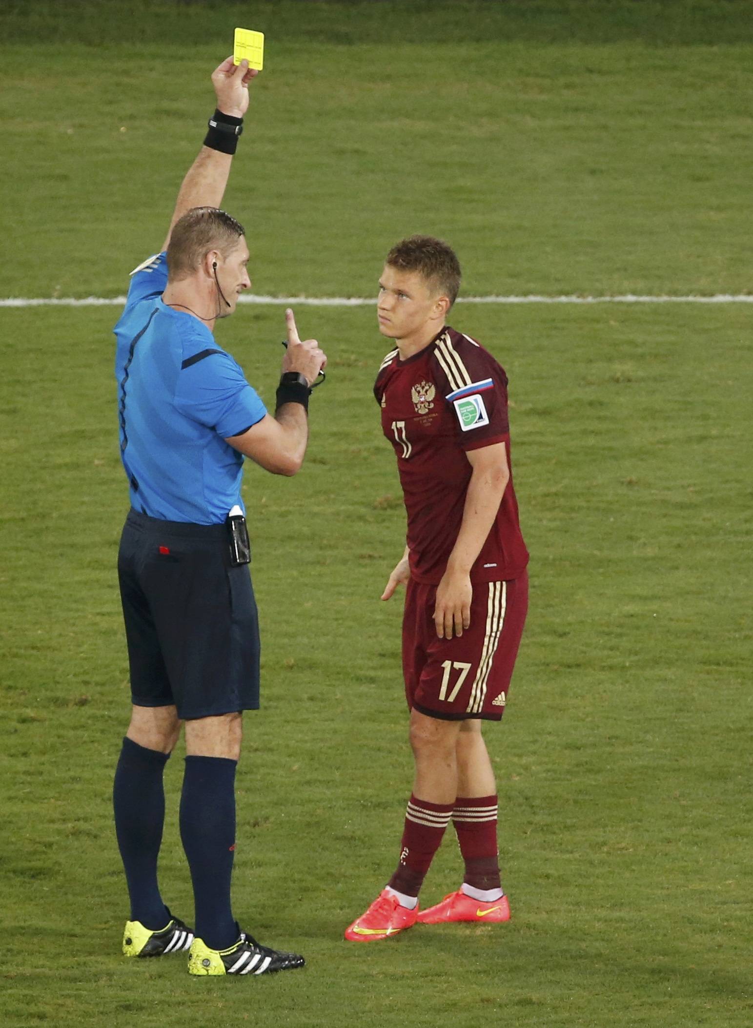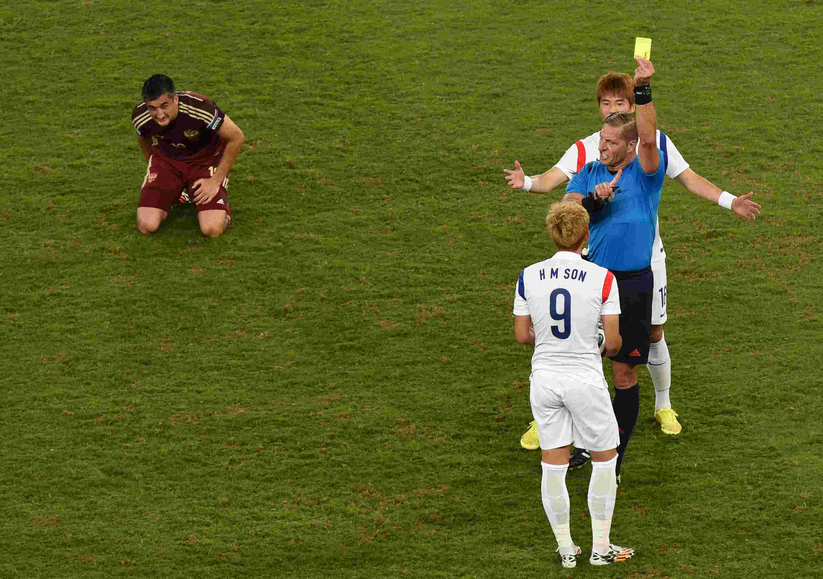 Уже на 13-й минуте он продемонстрировал, что не будет снисходителен к таким приемам, как атака соперника сзади, и показал Сон Хын Мину желтую карточку за грубый подкат под Самедова, а на 20-й минуте – Ки Сон Енму за опасный прыжок в ноги все тому же Самедову. На 49-й минуте заработал горчичник и Шатов – за грубую атаку Ку Джа Чхоля, а сам этот кореец получил карточку на 90-й минуте за срыв атаки сборной России, с чем я тоже полностью согласен. Кстати, на 61-й минуте за такое же нарушение Питане следовало наказать и нашего Ещенко, но он этого не сделал.