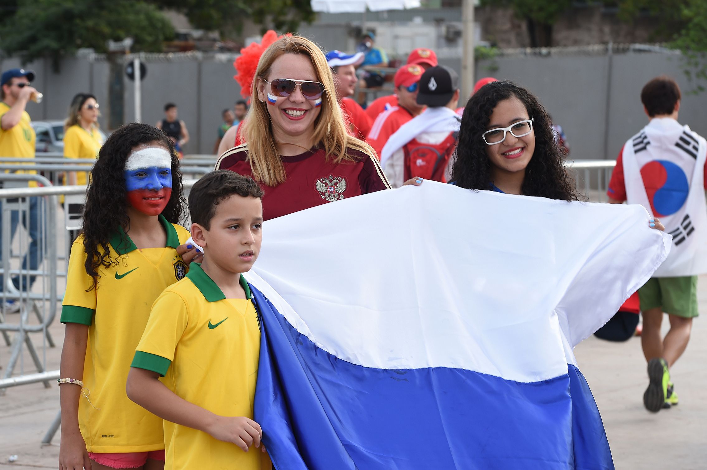 Уже на подступах к "Арене Пантанал" шебуршат наши соперники. Кореянки ищут лишний билетик и предлагают бесплатные обнимашки. Одежда на стыке манги и хентая практически гарантирует им успех. Корейцев больше, чем россиян, а наряды у них ярче и изобретательнее. Зато болельщики России громче и, как бы это объяснить, монументальнее. Если пришли, то сразу ух!