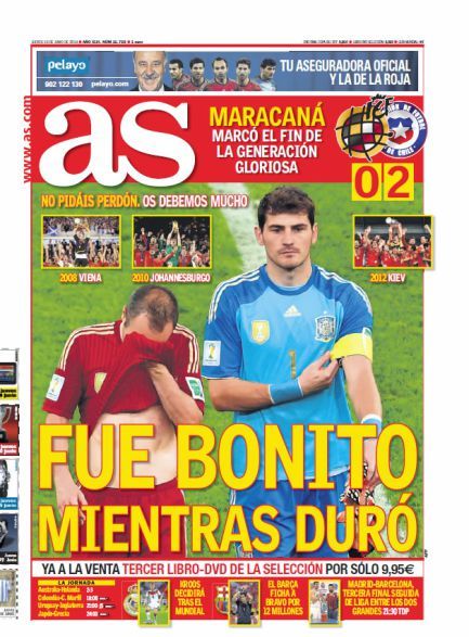 На первой полосе одной из ведущих испанских газет – три маленькие фотографии, напоминающие о больших триумфах испанской сборной на трех последних крупнейших турнирах: Вена-2008 (ЧЕ), Йоханнесбург-2010 (ЧМ), Киев-2012 (ЧЕ). И "шапка": "Это было здорово, пока это было".