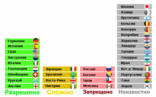 У многих команд есть четкая политика в области половой жизни, о которой они рассказали публично. Другие, как, например, Италия откровенных заявлений не делали, но позволяют футболистам свободно встречаться с женами и подругами на территории тренировочных баз и гостиниц. Такие сборные мы отнесли к числу тех команд, где секс разрешен.