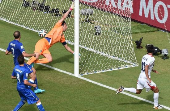 Перелом в игре? Да, но вовсе не в ту сторону, как всем думалось! Концовка тайма снова осталась за костариканцами, и на этот раз – фатально для "Скуадры адзурры". Для начала Буффону пришлось творить чудеса, выуживая мяч из самого гола, следом Дуарте затылком (!) исхитрился дотянуться и пробить, но чуть выше. Тут же главный герой матча с уругвайцами Кэмпбелл протиснулся между Кьеллини с Барцальи и рухнул. Отсутствие пенальти вызвало бешеное негодование Луиса Пинто, он метался по бровке, как ужаленный, но буквально через секунды его реакция, не изменившись по сути, означала уже дикую радость: Руис выскочил на подачу и пробил от перекладины с изумительной точностью. Вердикт "компьютерного судьи" был формальностью – все видели, что мяч линию пересек.