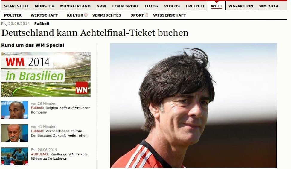 Если Spiegel в своих прогнозах сдержан и аккуратен, то Westf?lische Nachrichten в промежуточном успехе немецкой сборной уже почти не сомневается, пусть команде и осталось провести еще два матча. Впрочем, зависит тут все не только от Германии: окончательно все может проясниться лишь рано утром в понедельник по итогам встречи США – Португалия. Для начала, конечно, надо победить Гану, но это дело уже почти решенное.