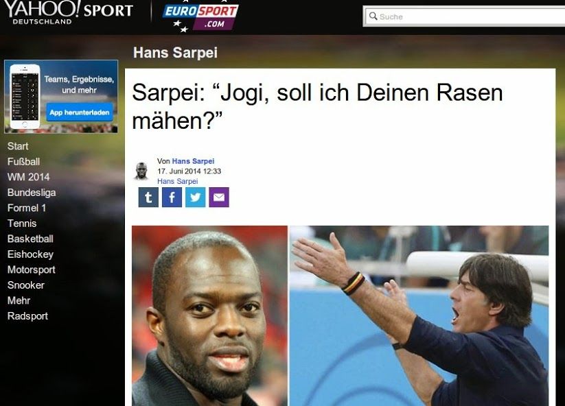 Такими словами озаглавил свою запись в блоге на сайте немецкой редакции "Евроспорта" известный в прошлом игрок сборной Ганы Ханс Сарпей. Бывший игрок "Байера" и "Шальке" теперь стал своего рода Чаком Норрисом немецкого интернета. Сарпей не предсказывает исходы – он определяет, как закончится матч. Сарпей забивает два гола одним ударом. Сарпей сам выбирает, за какую команду играть, и так далее. Так вот, если даже Ханс не знает, как его родной сборной набрать хотя бы одно очко, то дела Ганы действительно плохи. Хотя ничья Германии не повредит, считает Сарпей: с семью очками команда легко займет первое место в группе. Ради такого он готов полгода стричь лужайку перед домом бундестренера или подавать ему завтрак каждое утро. Вот только читает ли Лев блог главного героя немецкого интернета?