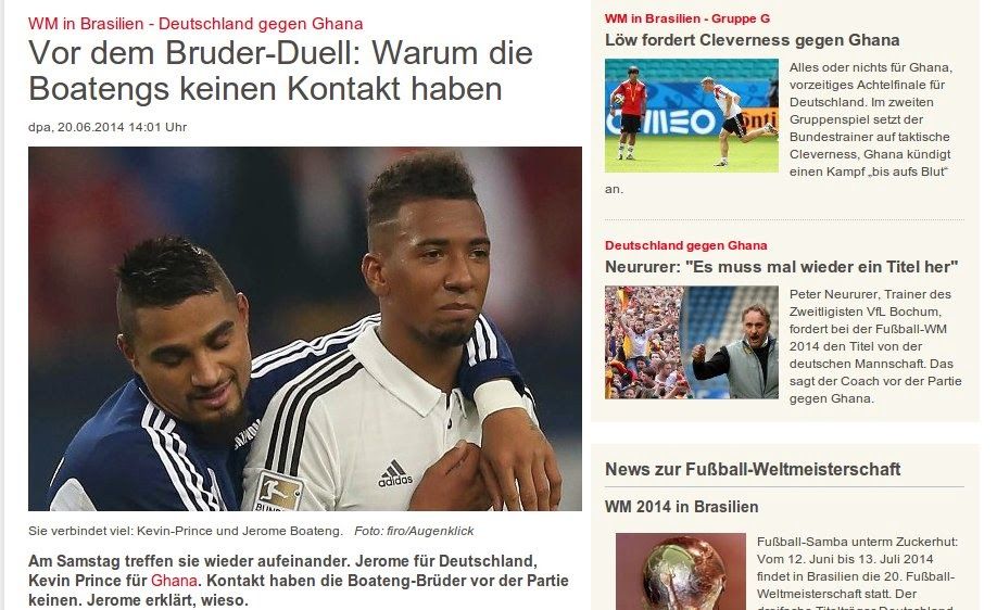 Возможная дуэль братьев Боатенг – одна из интриг предстоящего матча. Решили остановиться на ней и авторы Abendzeitung M?nchen. Родившиеся в Берлине братья играют в немецких клубах, при этом на международном уровне выступают за разные сборные. Общение между ними – привычное дело, но только не перед матчем национальных сборных. Но не надо искать тут какой-то подоплеки. "Иногда мы общаемся чуть больше, иногда чуть меньше", – говорит Жером, игрок сборной Германии. О брате и родине отца Боатенг немецкий подумает, конечно, во время исполнения гимна Ганы. Но потом сразу сосредоточится на другом. Тем более что его прямая дуэль с Кевином-Принсом в этом матче более чем вероятна.