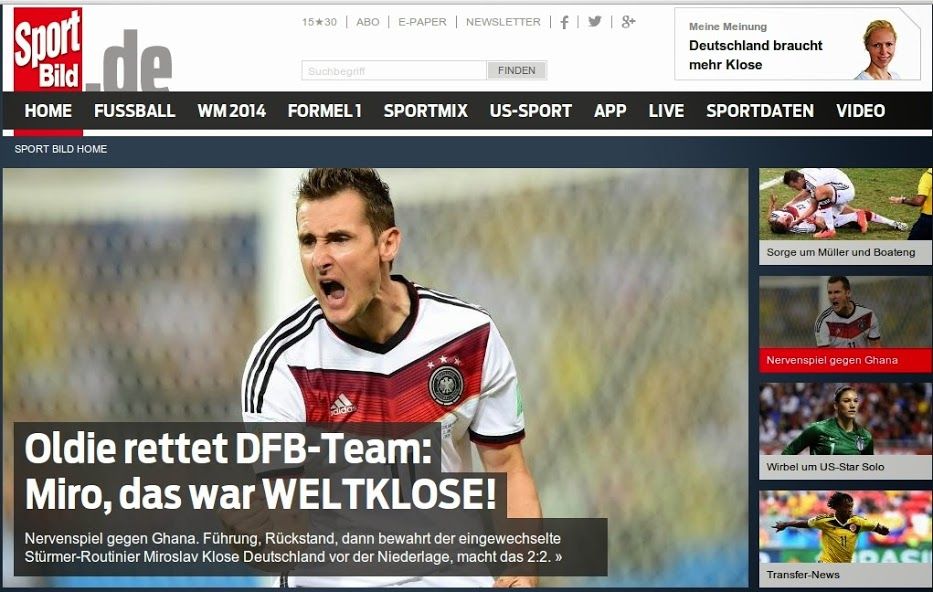 Этот заголовок Sportbild говорит сам за себя: Мирослав Клозе вышел на поле и через две минуты сравнял счет в матче. Если бы не он, неизвестно еще, как бы все закончилось, ведь Гана оказалась куда более серьезным соперником, чем Португалия. Настолько серьезным, что ошибался даже самый надежный игрок команды – Филипп Лам. Да и Мюллеру забить не дали: моменты у него, конечно, были, но его удары то и дело блокировали защитники африканской сборной. В общем, если бы не Клозе, быть сенсации. Хорошо, что у Лева в обойме есть форвард мирового класса!