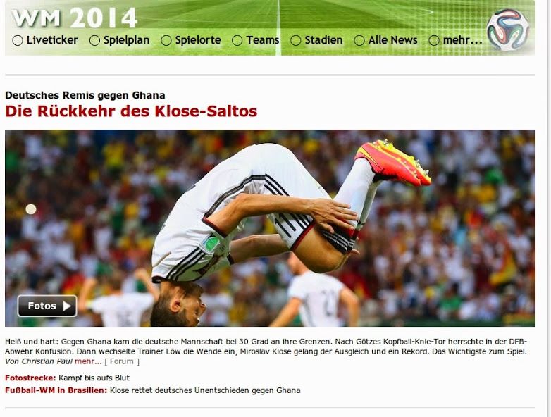 Подводя итог матча, Spiegel вводит новую рубрику. Помимо традиционных "итог", "цифры", "первый тайм" и "второй тайм" появляется экзотический пункт "сальто матча". Речь, конечно же, о праздновании второго гола немецкой сборной в исполнении Мирослава Клозе. Вообще-то игрок говорил, что больше не будет исполнять этот элемент. Все-таки Клозе уже 36 лет, надо бы и о здоровье подумать. Об это обещании, впрочем, он забыл через каких-то 120 секунд после своего выхода на поле, в очередной раз исполнив свой знаменитый кульбит. Приземление получилось не идеальным, но сути дела это не меняет: Клозе повторил рекорд Роналдо по количеству голов на чемпионатах мира. И это заслуживает уважения!