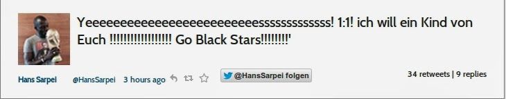 В недалеком прошлом футболист сборной Ганы и нескольких немецких клубов, а ныне оракул немецкого интернета Ханс Сарпей, напомним, перед игрой обещал полгода стричь лужайку или готовить завтрак для Йоахима Лева, если Гана наберет хотя бы одно очко. Так оно в итоге и произошло. Сдержит ли Сарпей свое слово, еще предстоит узнать. Пока же он крайне эмоционально следил за поединком, активно комментируя его ход в социальных сетях. Когда ганцы сравняли счет, Ханс написал буквально следующее: "Даааааааааааааа! 1-1. Я хочу ребенка от вас!!! Вперед, Черные звезды". Потом был бессмысленный набор букв, потом надежда на то, что при таком исходе обе команды выйдут в 1/8 финала. Если Ханс что-то говорит, то так оно обычно и происходит. Этот человек никогда не ошибается и все всегда знает заранее.