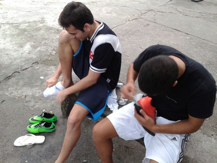 Достаю купюру в пять реалов (рублей 80), начинаем переодеваться. Пока совсем не стемнело, делаем совместное фото на телефон. Потихоньку подтягиваются остальные. Всего человек двадцать. Все – типичные кариоки. Дружелюбные, открытые, шумные. За пять минут узнаю имена всех, но запоминаю только четыре – тех, с кем играть в одной команде.