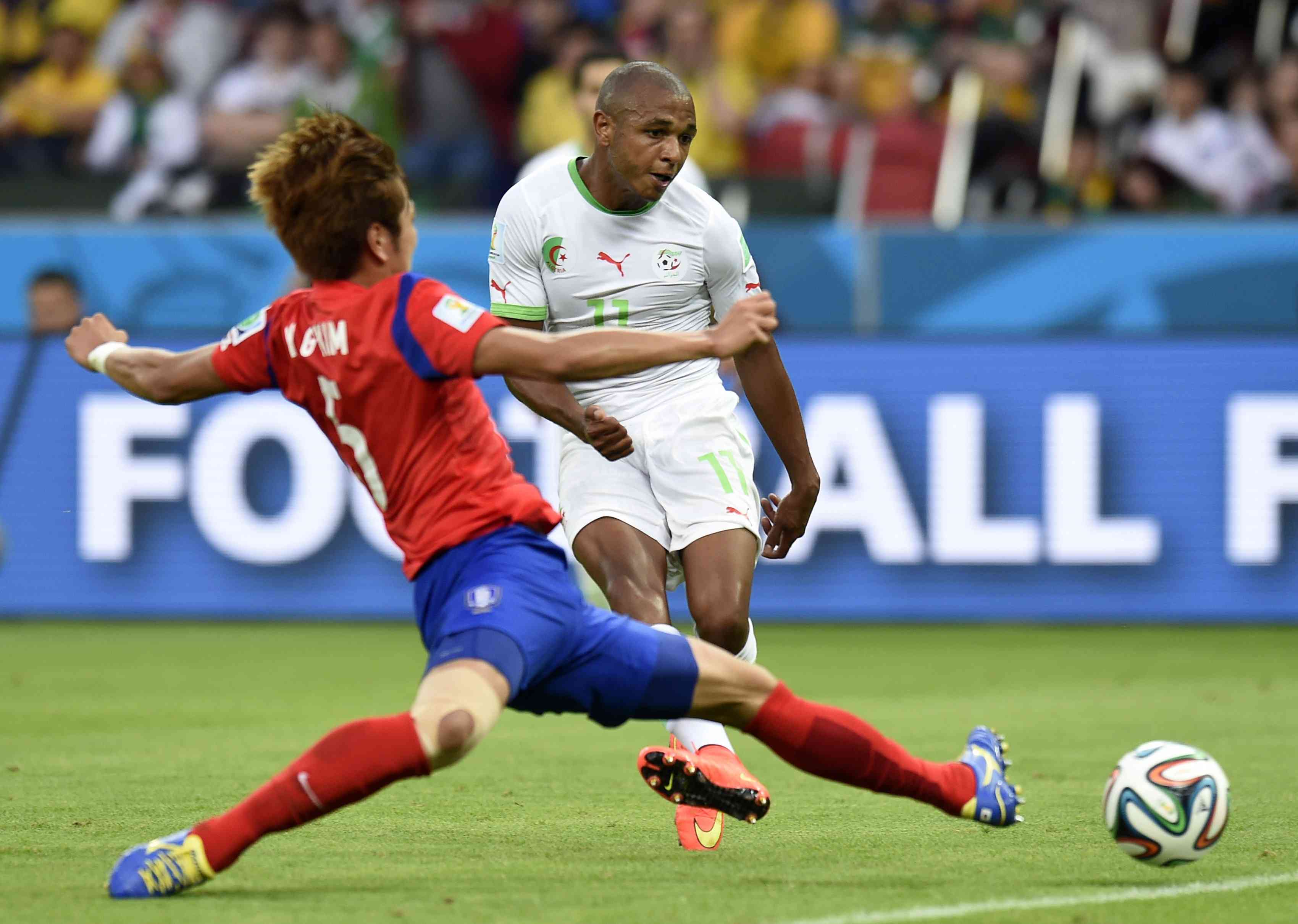 "Лисы пустыни" принялись бомбардировать ворота Чон Сон Рена с первых же атак. Поначалу не везло, и Вахид Халилходжич бурно взывал к небесам, когда Слимани раз за разом транжирил шансы. Прорвало форварда лиссабонского "Спортинга" на исходе получаса, с четвертой попытки: получив классный пас от Меджани, он с защитниками "на плечах" успел подсечь мяч над вратарем. И тут же подача углового привела в ступор корейскую оборону, которая как завороженная наблюдала за ударом Халлиша.