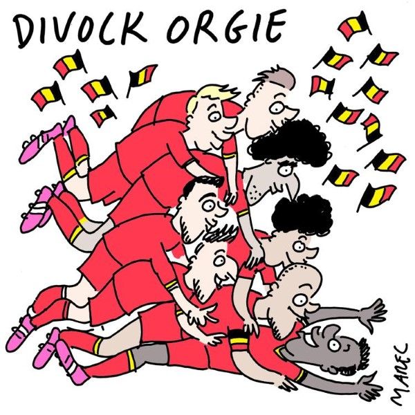 Nieuwsblad празднует выход "красных дьяволов" в 1/8 финала карикатурой, где обыгрывается созвучие фамилии Дивока Ориги со словом… оргия.