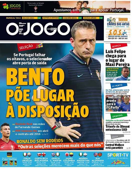 На первой полосе португальской газеты большое фото Паулу Бенту – в самой близкой к Бразилии европейской стране вовсю обсуждают возможность отставки тренера. Уже после двух игр групповой стадии стало ясно – португальцы чемпионат мира провалили, выйти в плей-офф им поможет только чудо.