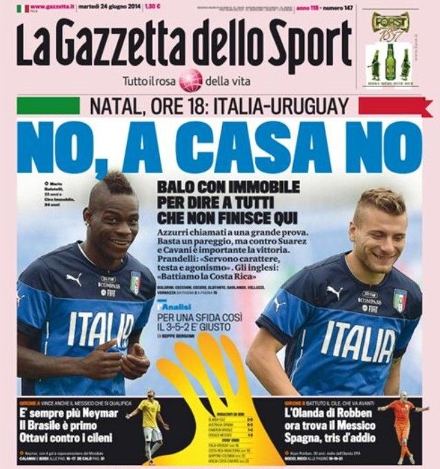 На обложке красуются Балотелли и Иммобиле, а подпись гласит – "Только не домой!" Оно и не мудрено – сегодня итальянцам предстоит ключевой матч в борьбе за выход в 1/8 финала. Проиграют – и все мольбы журналистов пойдут насмарку. Небольшое изображение Неймара на этом фоне смотрится более чем скромно.