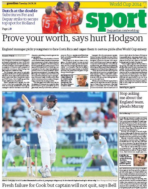 Первая полоса почти целиком отдана под крикет, хотя для критической заметке о Рое Ходжсоне там тоже место нашлось. Из вчерашних матчей ЧМ британцы больше всего впечатлились победой голландцев над чилийцами. Рассказывая об игре бразильцев с Камеруном, англичане тоже сделали фокус на незаменимости Неймара для "селесао".