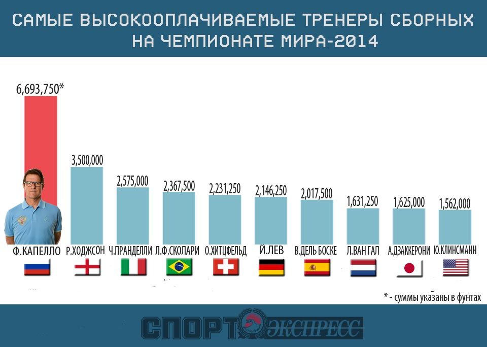 Британское издание Daily Mail опубликовало данные о зарплатах специалистов, возглавляющих все 32 сборные ЧМ-2014. Наш итальянец Фабио Капелло – единоличный лидер с огромным отрывом.